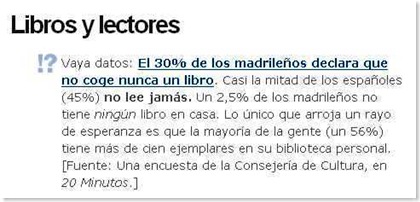 Todos los años los señores de las librerías, de las editoriales, nos enrostran nuestra falta de interés en la lectura. A ellos no les importa que te leas los periódicos de pe a pa buscando ese empleo tan necesitado, que gastes silla leyendo 'paquitos' en el Parque San José o resuelvas crucigramas y sopas de letras. No les vale. Como tampoco las novelitas de vaquero o leer los mensajes del msn o mail o las vallas publicitarias o las cartas de despido.